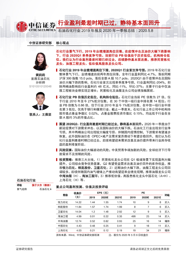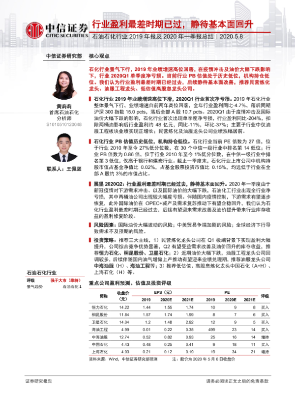 【中信证券】【20200508】石油石化行业2019年报及2020年一季报总结:行业盈利最差时期已过,静待基本面回升-12页