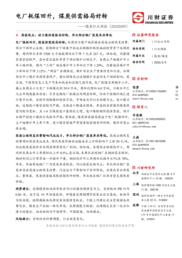 【川财证券】【20200509】20200509-川财证券-煤炭行业周报:电厂耗煤回升,煤炭供需格局好转-13页