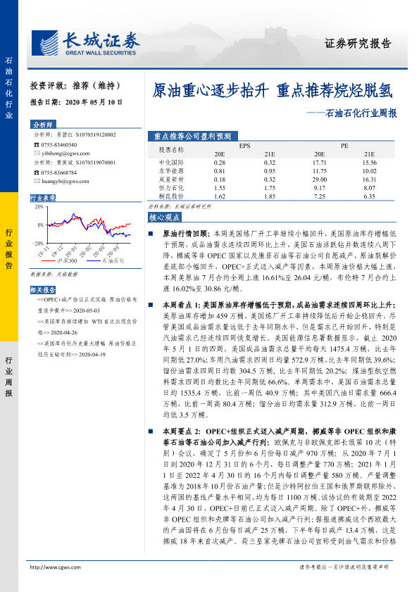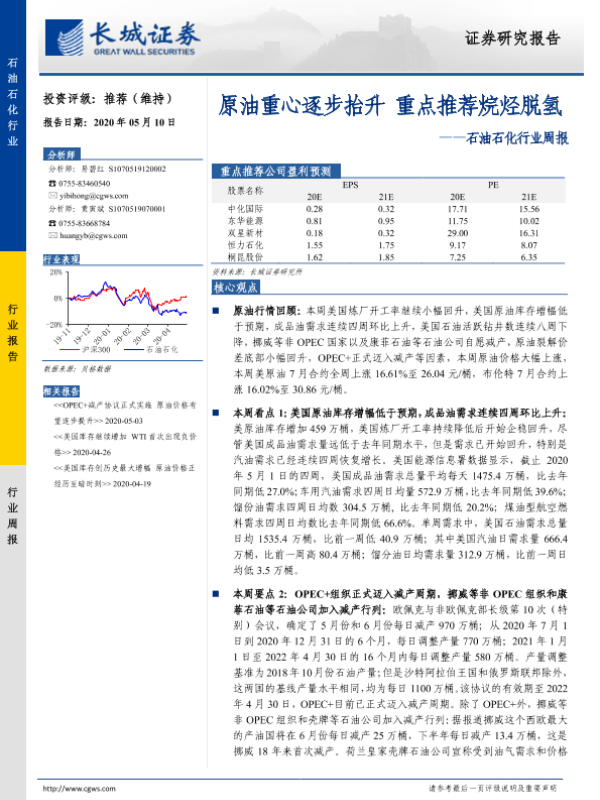 【长城证券】【20200510】20200510-长城证券-石油石化行业周报:原油重心逐步抬升 重点推荐烷烃脱氢-12页