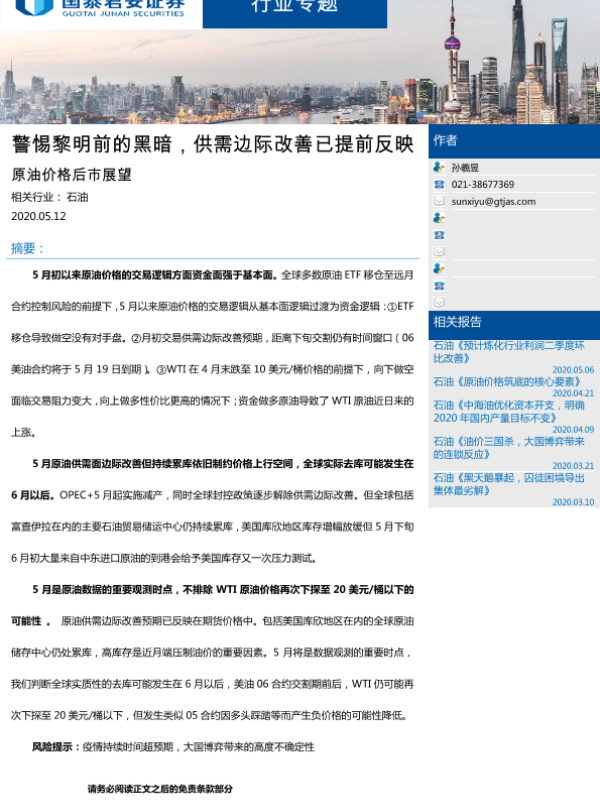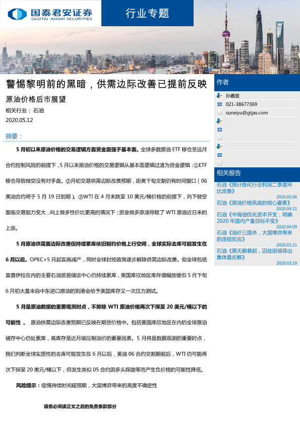 【国泰君安证券】【20200512】原油价格后市展望:警惕黎明前的黑暗,供需边际改善已提前反映-19页