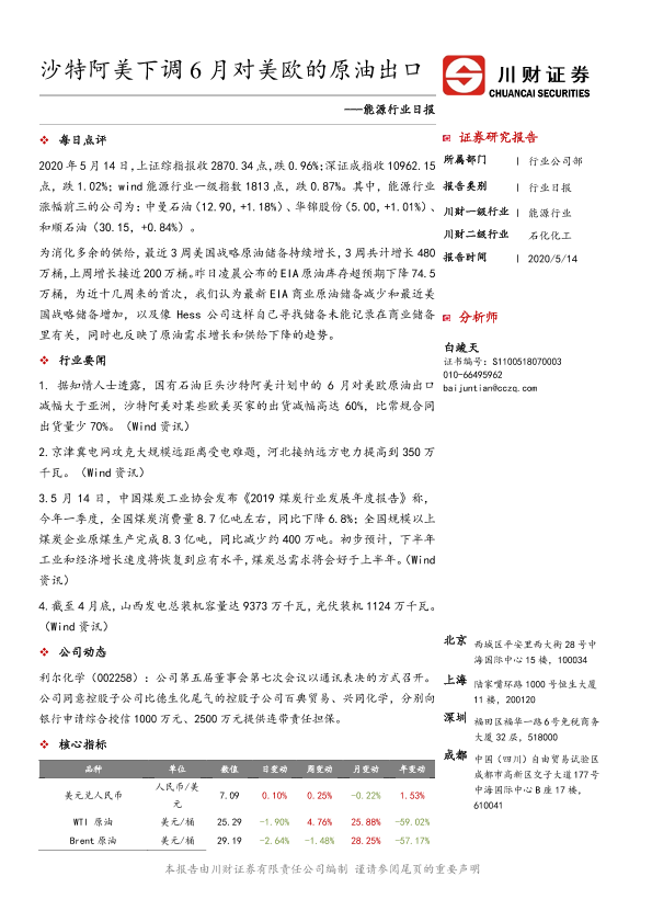 【川财证券】【20200514】能源行业日报:沙特阿美下调6月对美欧的原油出口-3页