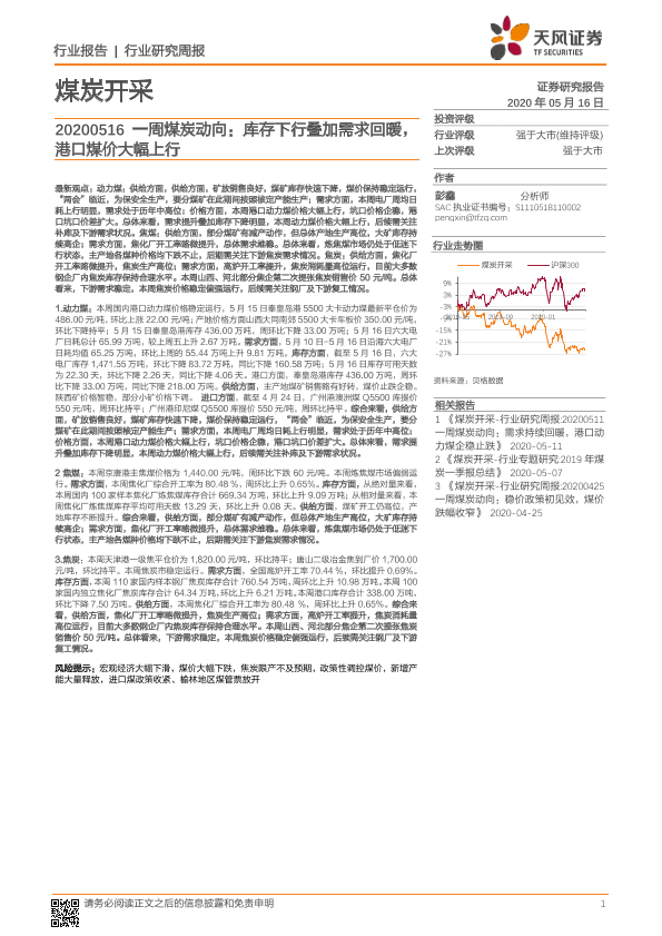 【天风证券】【20200516】20200516-天风证券-煤炭开采:一周煤炭动向:库存下行叠加需求回暖,港口煤价大幅上行-19页