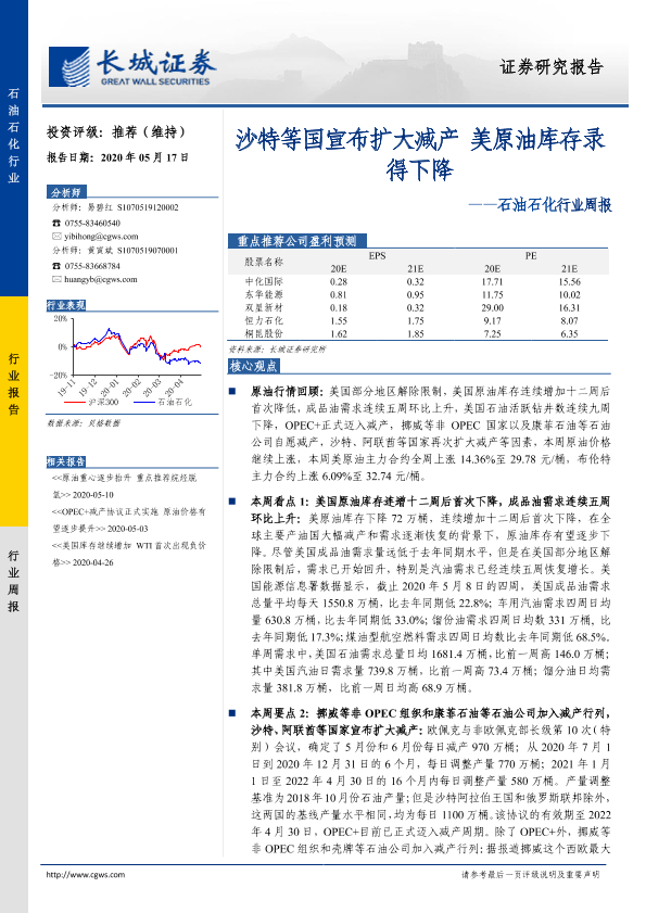 【长城证券】【20200517】20200517-长城证券-石油石化行业周报:沙特等国宣布扩大减产 美原油库存录得下降-12页