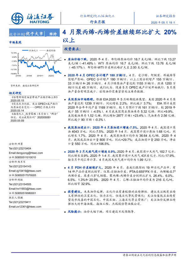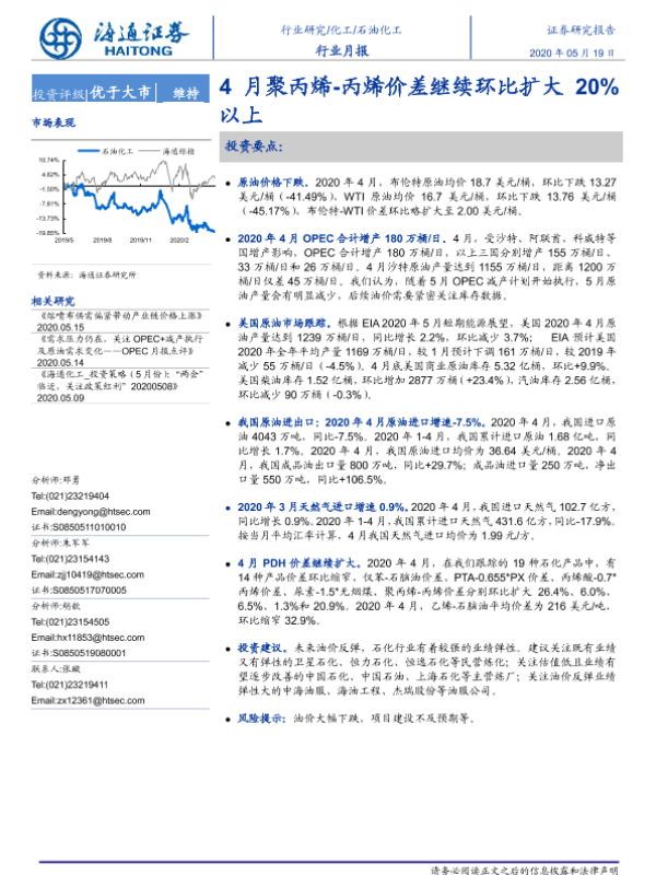 【海通证券】【20200519】20200519-海通证券-石油化工行业月报:4月聚丙烯-丙烯价差继续环比扩大20%以上-8页