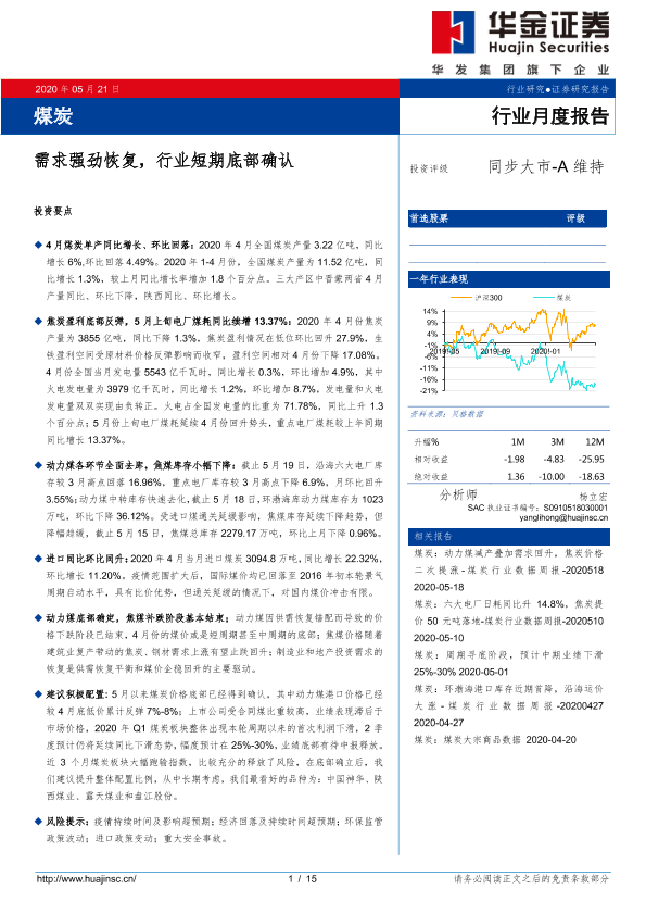【华金证券】【20200521】20200521-华金证券-煤炭行业月度报告:需求强劲恢复,行业短期底部确认-15页