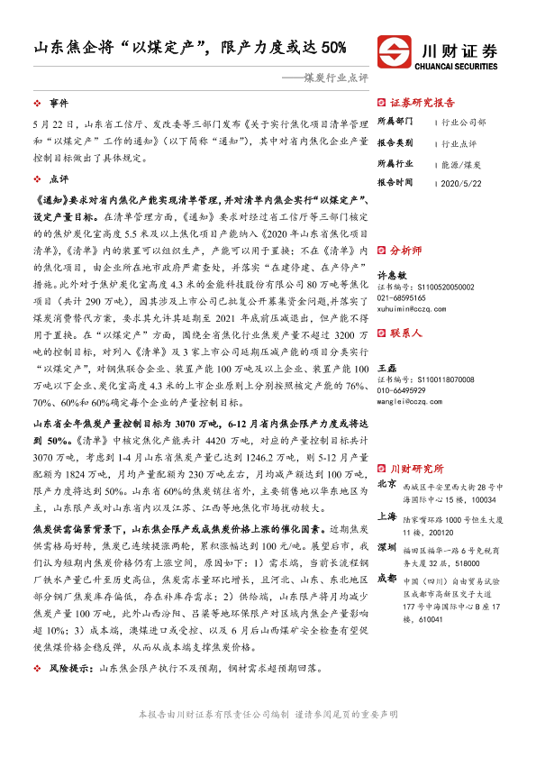 【川财证券】【20200522】煤炭行业点评:山东焦企将“以煤定产”,限产力度或达50%-2页