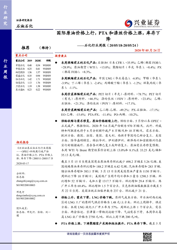 【兴业证券】【20200524】石油石化行业周报:国际原油价格上行,PTA和涤丝价格上涨,库存下降-13页