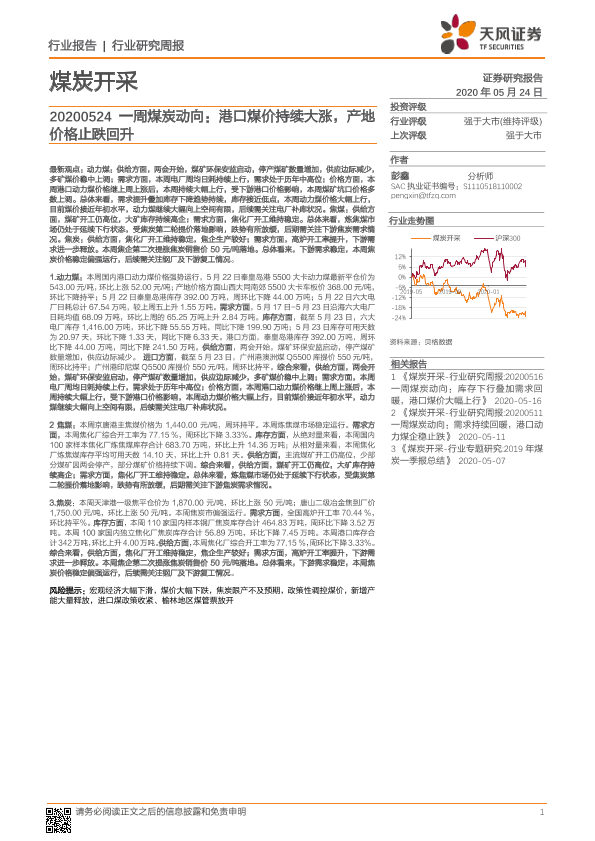 【天风证券】【20200524】20200524-天风证券-煤炭开采一周煤炭动向:港口煤价持续大涨,产地价格止跌回升-19页