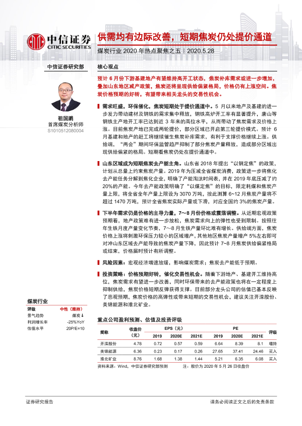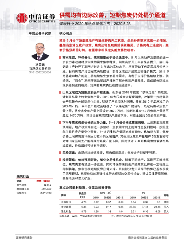 【中信证券】【20200528】煤炭行业2020年热点聚焦之五:供需均有边际改善,短期焦炭仍处提价通道-11页