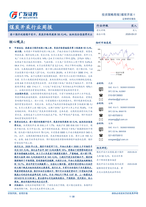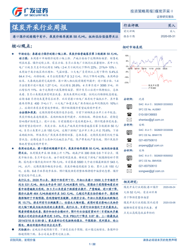 【广发证券】【20200531】20200531-广发证券-煤炭开采行业周报:港口煤价延续稳中有升,焦炭价格再提涨50元 吨,板块低估值值得关注-22页