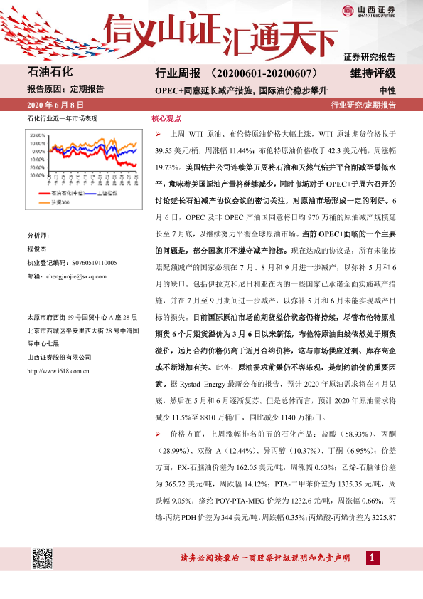 【山西证券】【20200608】20200608-山西证券-石油化工行业周报:OPEC+同意延长减产措施,国际油价稳步攀升-15页