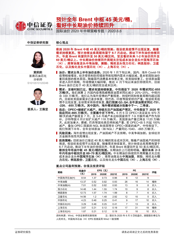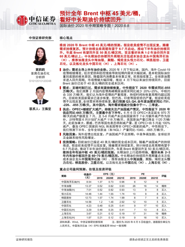 【中信证券】【20200608】国际油价2020年中期策略专题:预计全年Brent中枢45美元/桶,看好中长期油价持续回升-20页