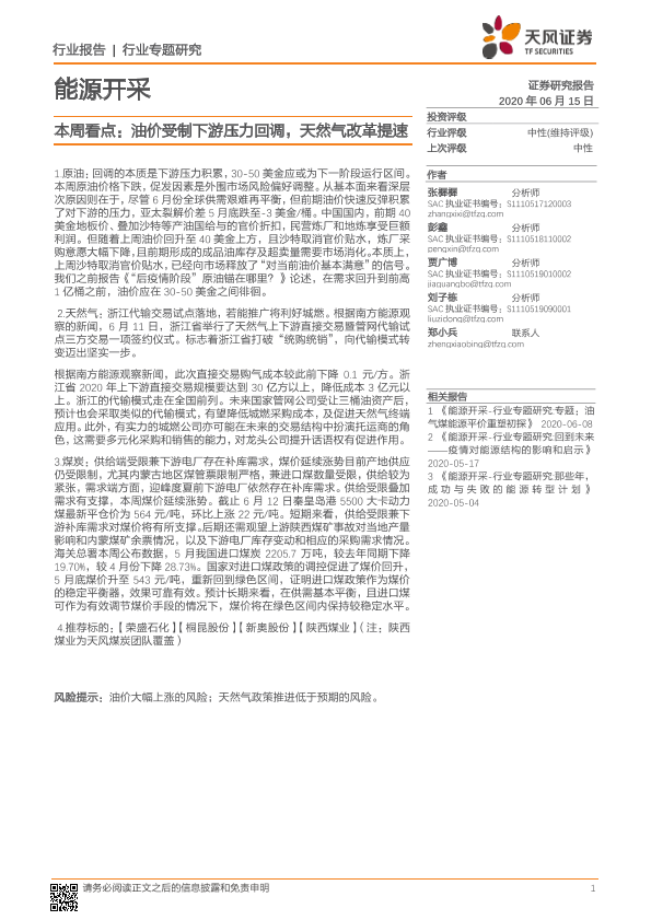 【天风证券】【20200615】能源开采本周看点:油价受制下游压力回调,天然气改革提速-2页