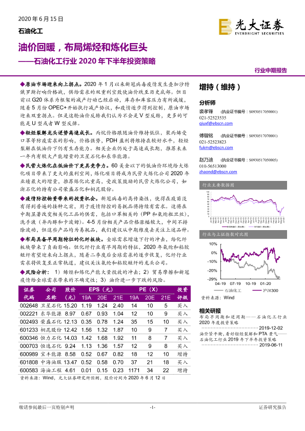 【光大证券】【20200615】石油化工行业2020年下半年投资策略:油价回暖,布局烯烃和炼化巨头-28页