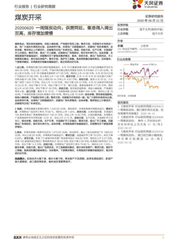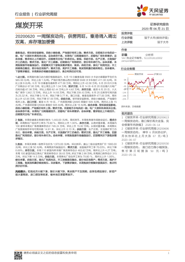 【天风证券】【20200621】20200621-天风证券-一周煤炭动向:供需两旺,秦港调入调出双高,库存增加缓慢-19页