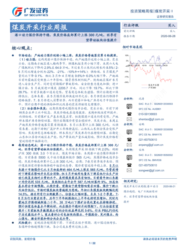 【广发证券】【20200628】20200628-广发证券-煤炭开采行业周报:港口动力煤价保持平稳,焦炭价格底部累计上涨300元/吨,旺季有望带动板块估值提升-22页