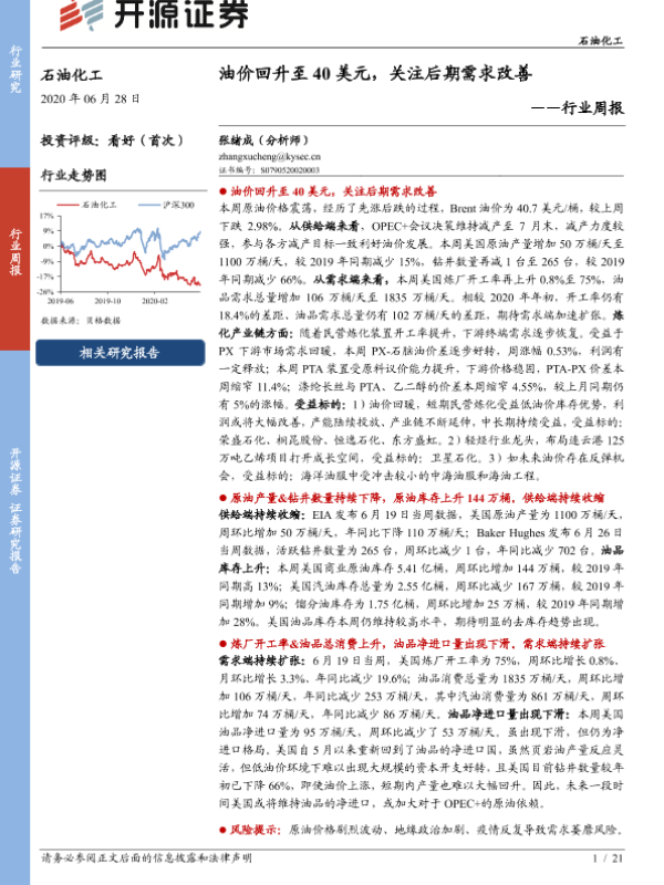 【开源证券】【20200628】20200628-开源证券-石油化工行业周报:油价回升至40美元,关注后期需求改善-21页