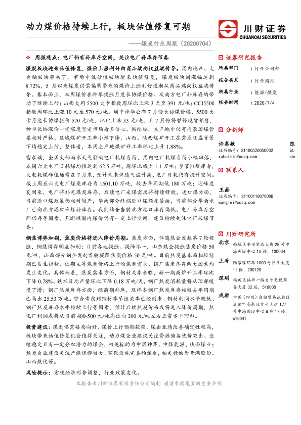 【川财证券】【20200704】20200704-川财证券-煤炭行业周报:动力煤价格持续上行,板块估值修复可期-13页