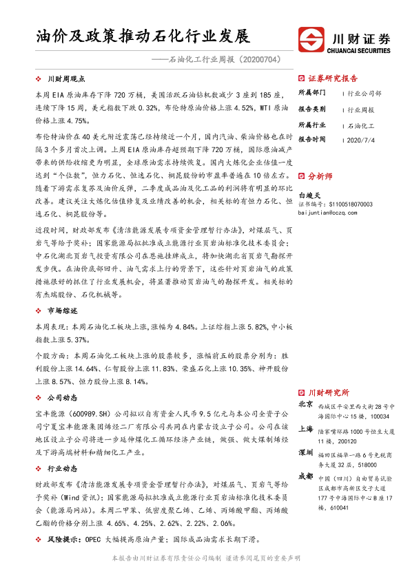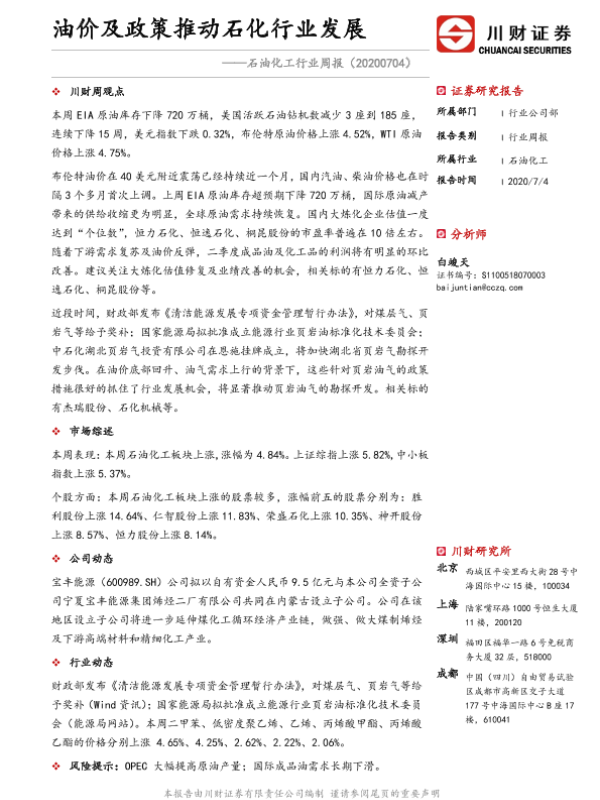 【川财证券】【20200704】20200704-川财证券-石油化工行业周报:油价及政策推动石化行业发展-12页