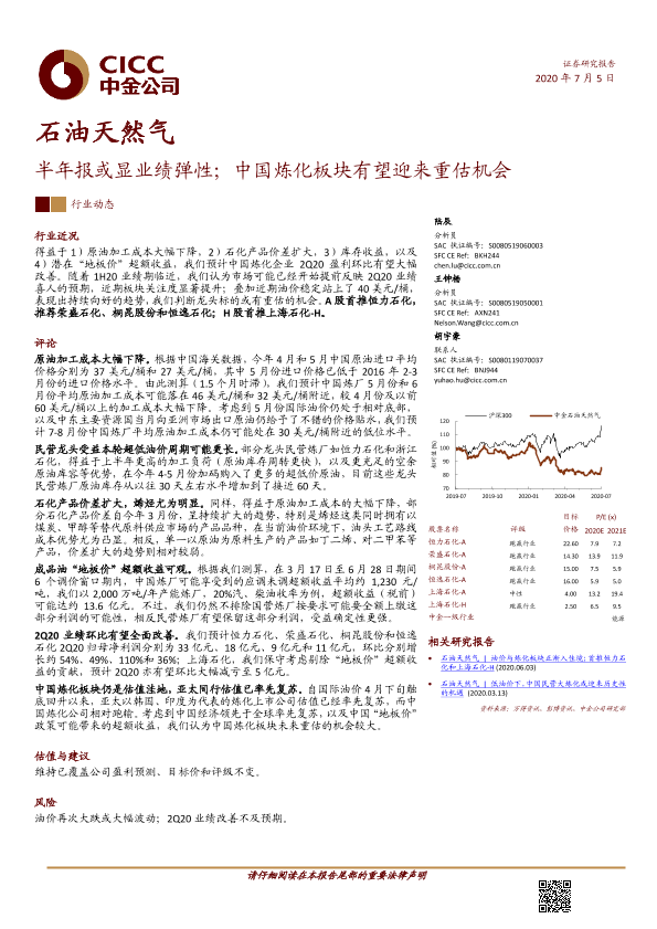 【中金公司】【20200705】石油天然气半年报或显业绩弹性;中国炼化板块有望迎来重估机会-7页