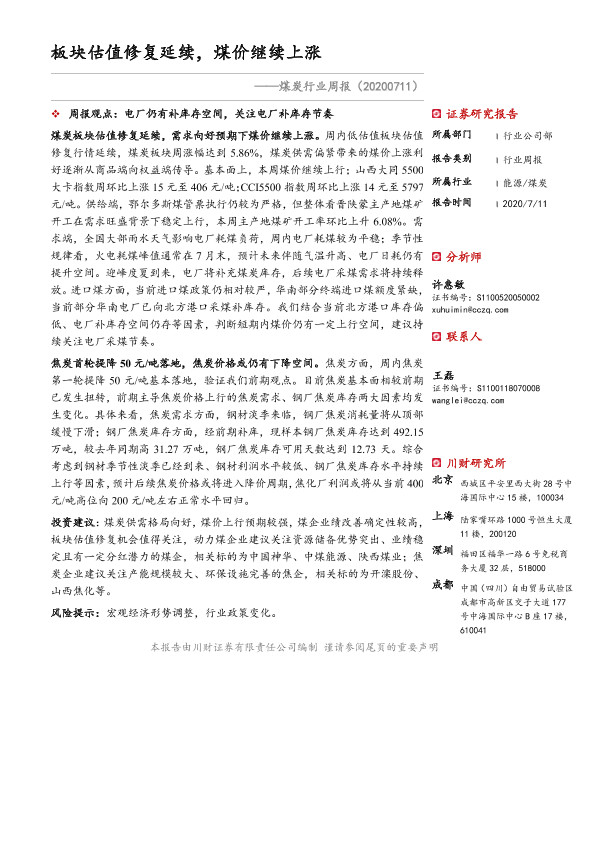 【川财证券】【20200711】20200711-川财证券-煤炭行业周报:板块估值修复延续,煤价继续上涨-12页