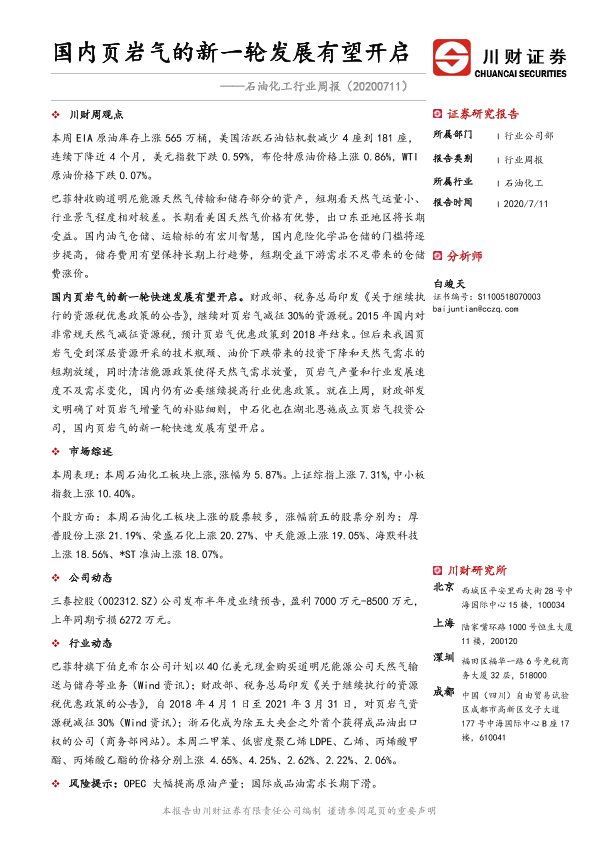油气仓储 石油化工 行业周报 资源税优惠 页岩气