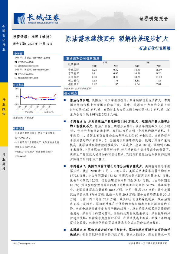 【长城证券】【20200712】石油石化行业周报:原油需求继续回升 裂解价差逐步扩大-10页