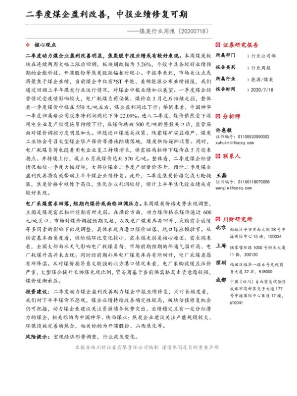 【川财证券】【20200718】20200718-川财证券-煤炭行业周报:二季度煤企盈利改善,中报业绩修复可期-12页