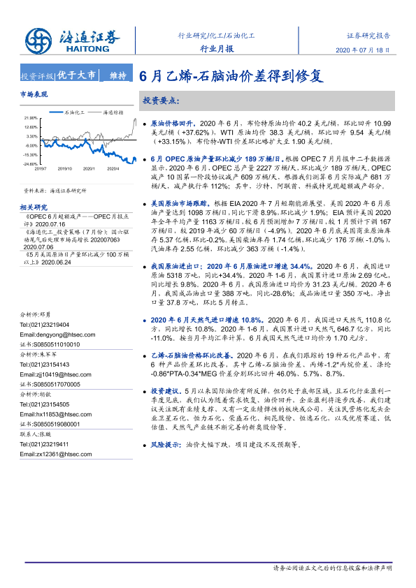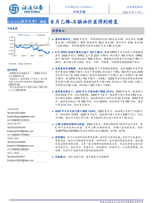 【海通证券】【20200718】20200718-海通证券-石油化工行业月报:6月乙烯-石脑油价差得到修复-8页