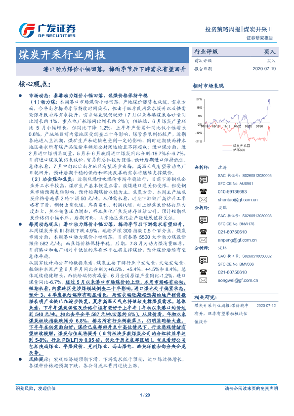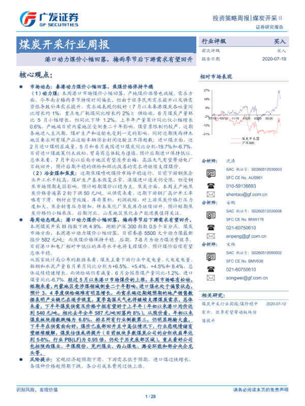 【广发证券】【20200719】20200719-广发证券-煤炭开采行业周报:港口动力煤价小幅回落,梅雨季节后下游需求有望回升-23页
