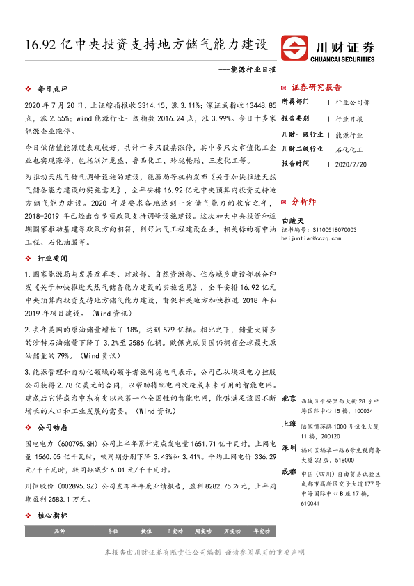 【川财证券】【20200720】20200720-川财证券-能源行业日报:16.92亿中央投资支持地方储气能力建设-3页