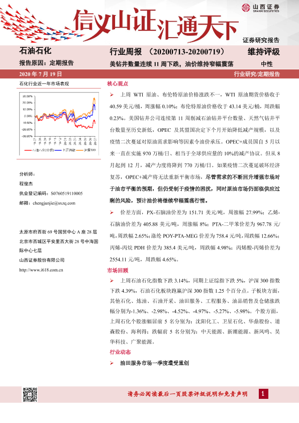 【山西证券】【20200719】20200719-山西证券-石油石化行业周报:美钻井数量连续11周下跌,油价维持窄幅震荡-14页