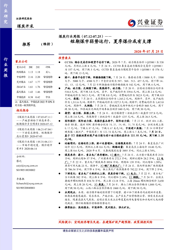 【兴业证券】【20200725】煤炭行业周报(07.12-07.25)——短期煤市弱势运行,夏季煤价或有支撑-16页