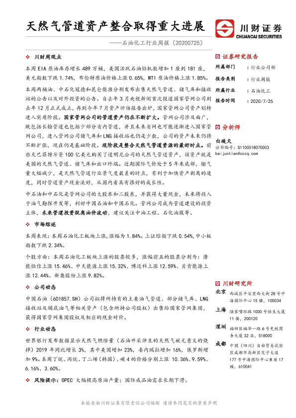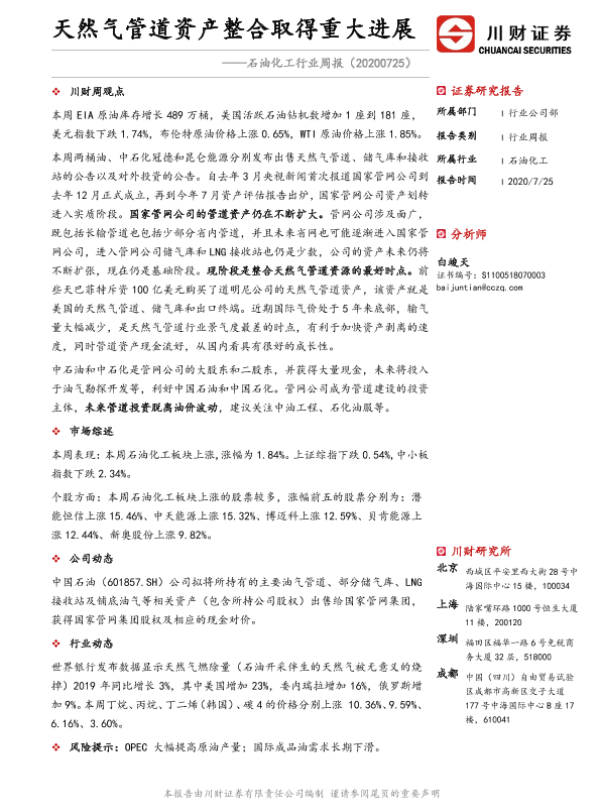 【川财证券】【20200725】石油化工行业周报:天然气管道资产整合取得重大进展-12页