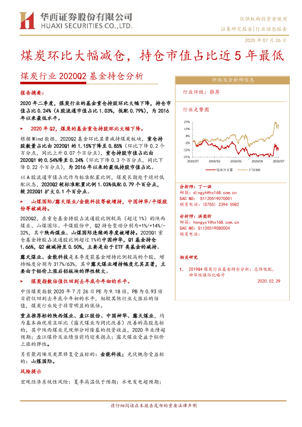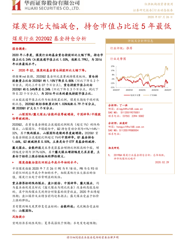 【华西证券】【20200726】煤炭行业2020Q2基金持仓分析:煤炭环比大幅减仓,持仓市值占比近5年最低-11页