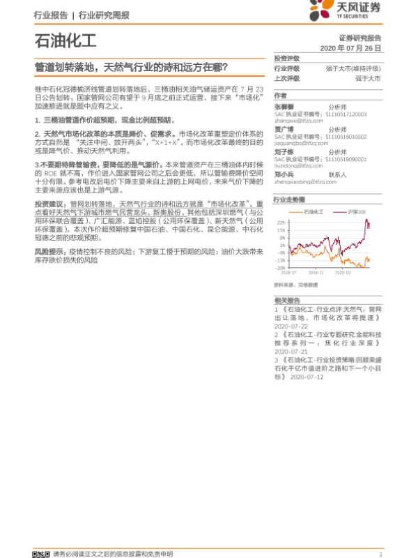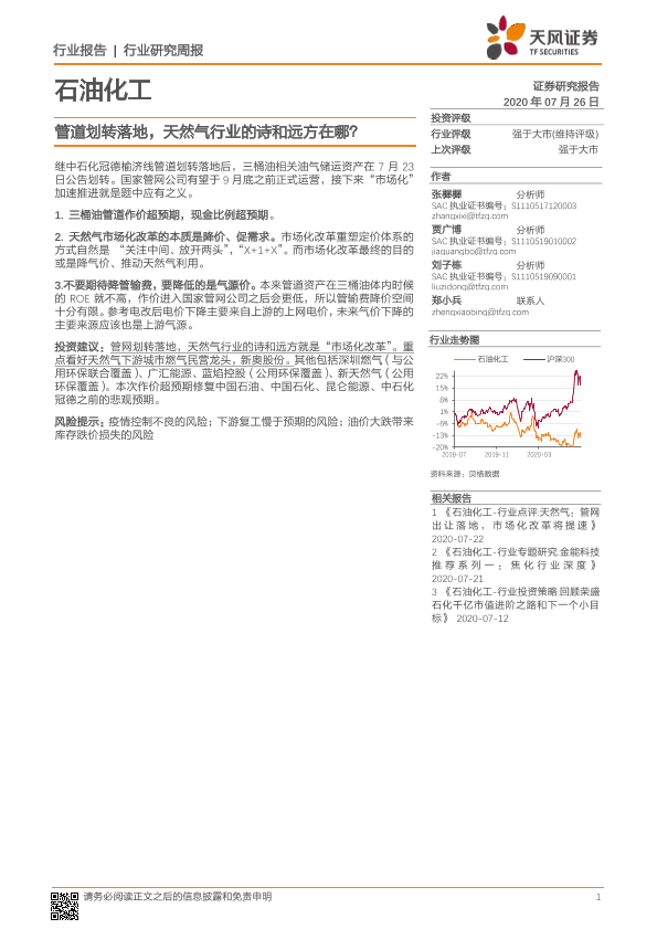 【天风证券】【20200726】石油化工行业研究周报:管道划转落地,天然气行业的诗和远方在哪?-4页