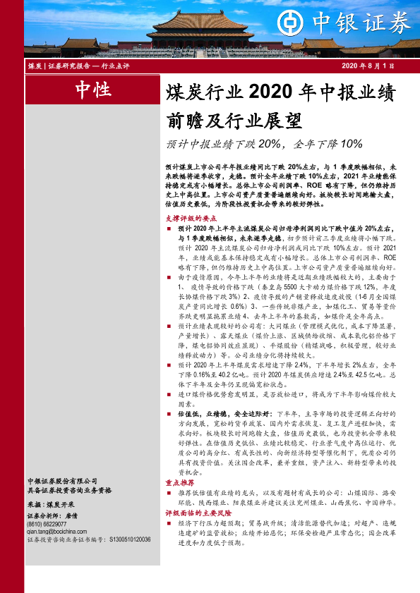 【中银证券】【20200801】煤炭行业2020年中报业绩前瞻及行业展望:预计中报业绩下跌20%,全年下降10%-20页