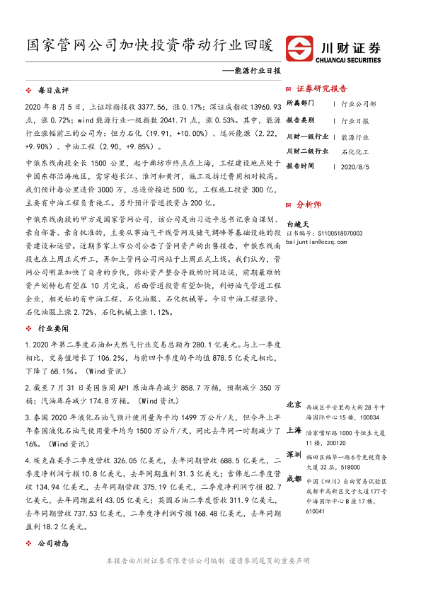 【川财证券】【20200805】能源行业日报:国家管网公司加快投资带动行业回暖-4页