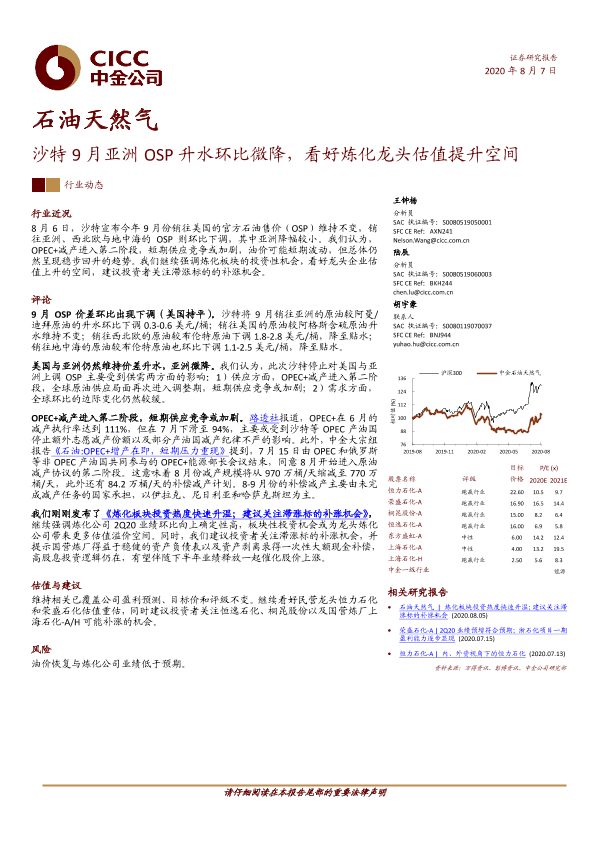 【中金公司】【20200807】石油天然气行业动态:沙特9月亚洲OSP升水环比微降,看好炼化龙头估值提升空间-6页