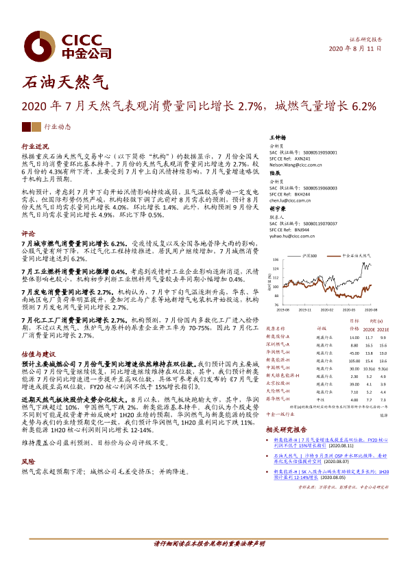 【中金公司】【20200811】2020年7月天然气表观消费量同比增长2.7%,城燃气量增长6.2%-5页