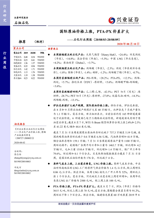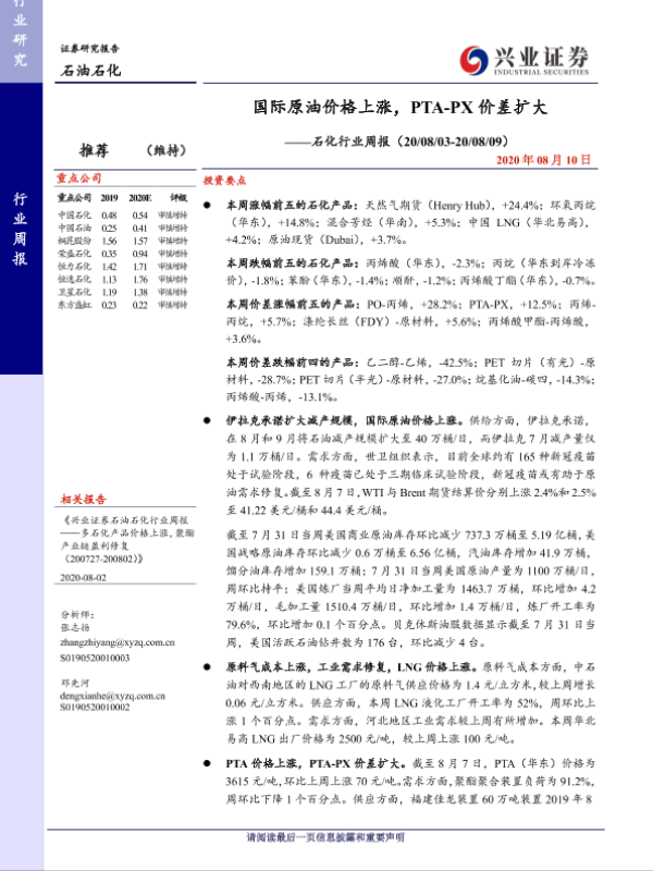 【兴业证券】【20200810】20200810-兴业证券-石化行业周报:国际原油价格上涨,PTA-PX价差扩大-13页
