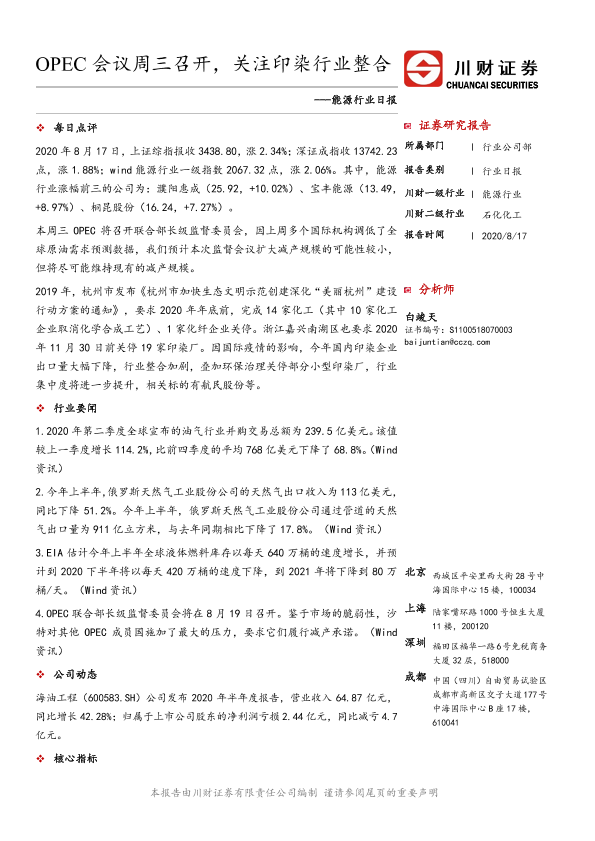 【川财证券】【20200817】能源行业日报:OPEC会议周三召开,关注印染行业整合-3页