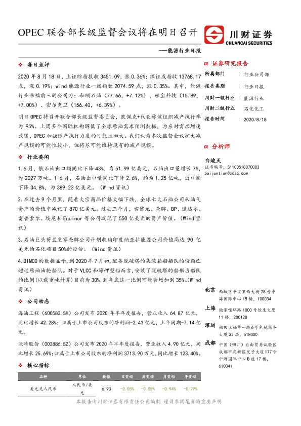 【川财证券】【20200818】能源行业日报:OPEC联合部长级监督会议将在明日召开-3页