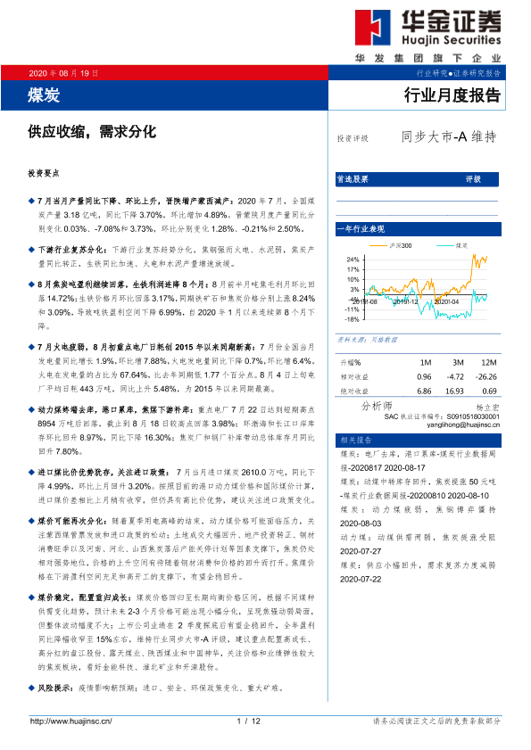 【华金证券】【20200819】20200819-华金证券-煤炭行业月度报告:供应收缩,需求分化-12页