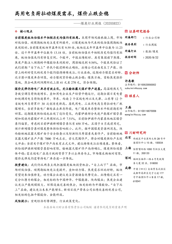 【川财证券】【20200822】20200822-川财证券-煤炭行业周报:高用电负荷拉动煤炭需求,煤价止跌企稳-12页