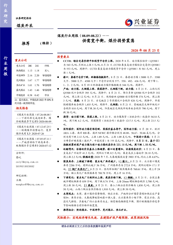 【兴业证券】【20200823】煤炭行业周报(08.09-08.22)——供需宽平衡,煤价弱势震荡-16页