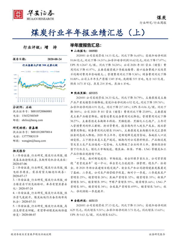 业绩汇总 半年报 煤炭行业 行业周报 证券研究