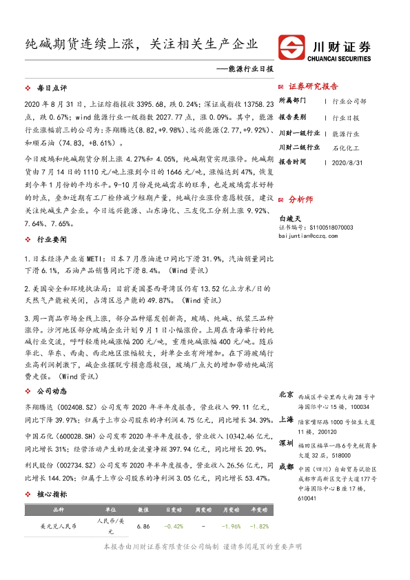 【川财证券】【20200831】能源行业日报:纯碱期货连续上涨,关注相关生产企业-3页