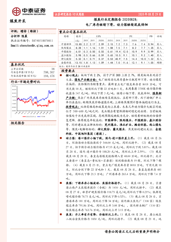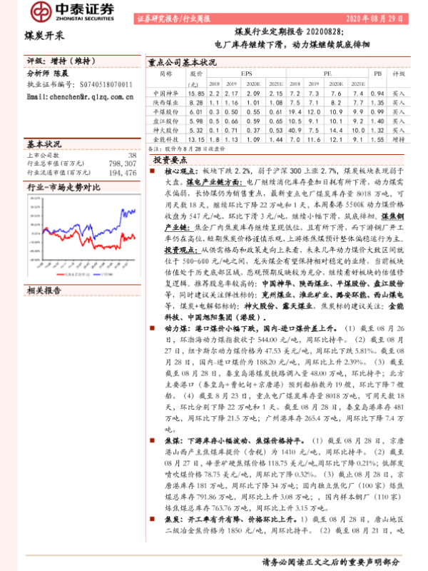 【中泰证券】【20200829】20200829-中泰证券-煤炭行业定期报告:电厂库存继续下滑,动力煤继续筑底徘徊-20页