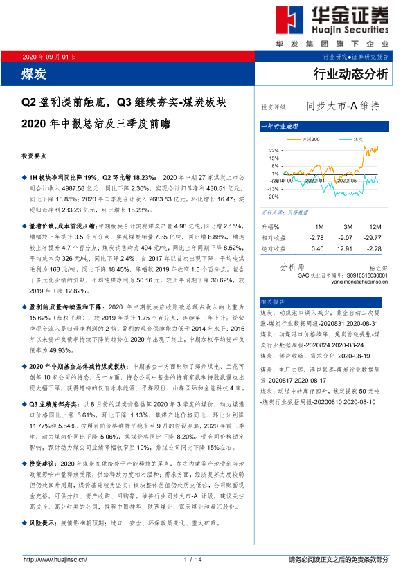 【华金证券】【20200901】煤炭行业动态分析:Q2盈利提前触底,Q3继续夯实-煤炭板块2020年中报总结及三季度前瞻-14页
